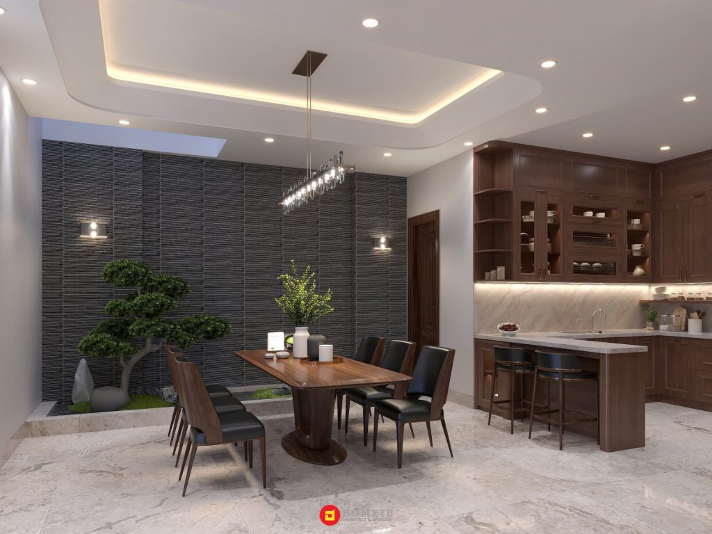 Yếu tố đồ dùng nội thất hiện đại trong thiết kế biệt thự Á Đông đóng vai trò cân bằng giữa truyền thống và tiện nghi đương đại. Dù giữ nguyên tinh thần tối giản, mộc mạc đặc trưng, nội thất hiện đại được lựa chọn kỹ lưỡng để đảm bảo tính thẩm mỹ và công năng. Các vật dụng như sofa, đèn trang trí, thiết bị bếp hay hệ thống điều khiển thông minh được tích hợp khéo léo, không làm phá vỡ tổng thể mà còn tôn lên vẻ đẹp tinh tế của không gian. Sự kết hợp này giúp nâng tầm trải nghiệm sống – tiện nghi, thoải mái nhưng vẫn giữ được hồn cốt văn hóa phương Đông.